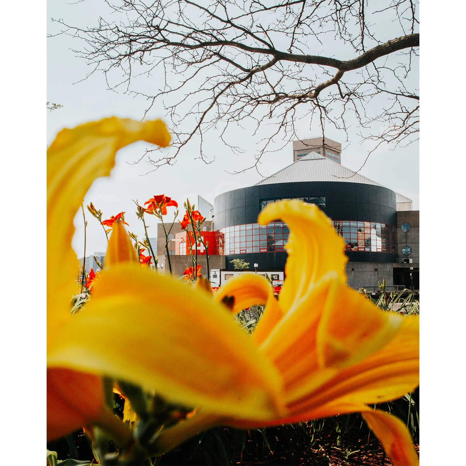 Flowers bloom in the Inner Harbor framing the National Aquarium.